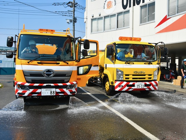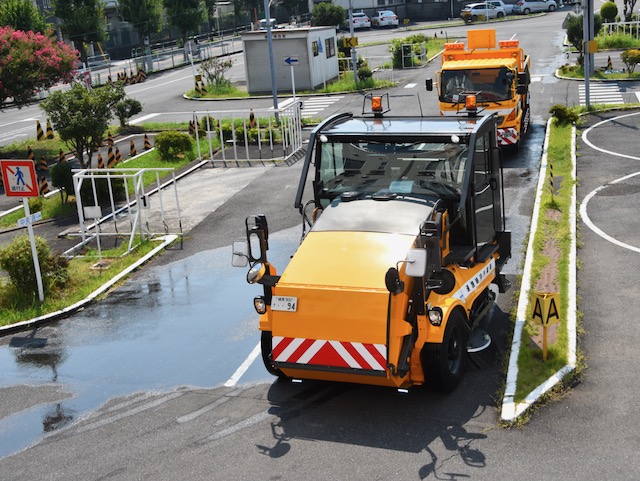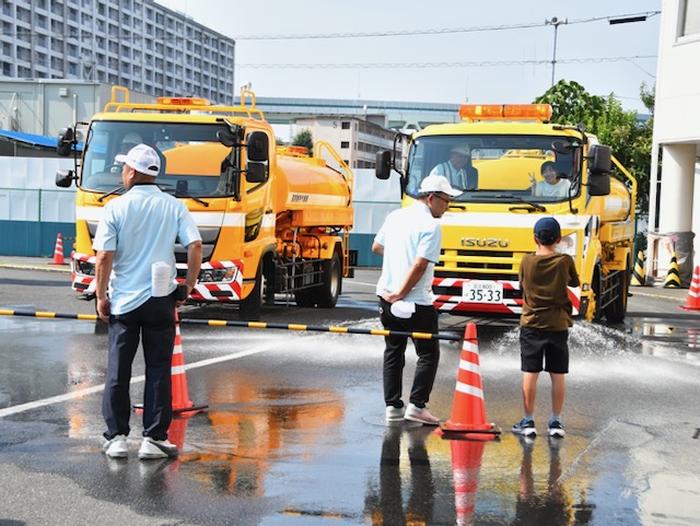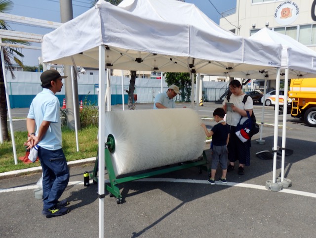その後、ロードスイーパー2台に子どもや親御さんが乗車し自動車学校のコースをゆっくり走行した。また、参加者は散水車の散水体験やロードスイーパーの展示ブラシを触ったりして大きさを体感することでき、楽しんでいた。